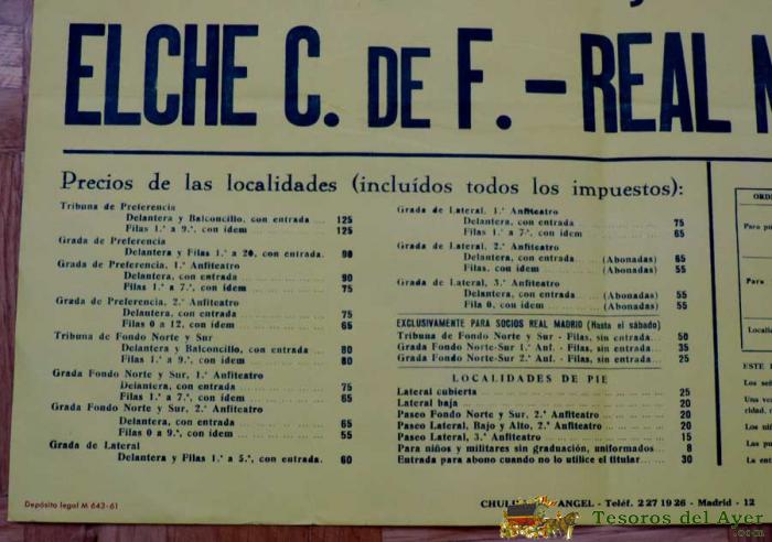 1961, CARTEL ORIGINAL REAL MADRID, ELCHE C. DE F., CAMPENATO DE LIGA PRIMERA DIVISION, 2 DE SEPTIEMBRE DE 1961, ALTAMIRA S.A., ESTADIO SANTIAGO BERNABEU - MIDE 70 X 50 CMS - RARISIMO, PIEZA DE MUSEO.