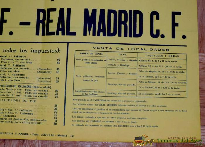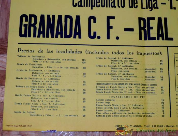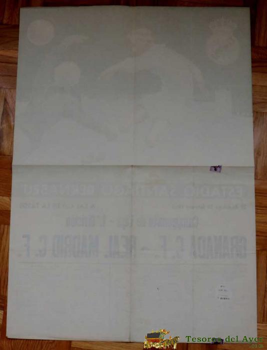 1961, CARTEL ORIGINAL REAL MADRID, GRANADA C. F., CAMPEONATO DE LIGA, PRIMERA DIVISION, 19 DE FEBRERO DE 1961, ALTAMIRA S.A., ESTADIO SANTIAGO BERNABEU - MIDE 70 X 50 CMS - RARISIMO, PIEZA DE MUSEO.