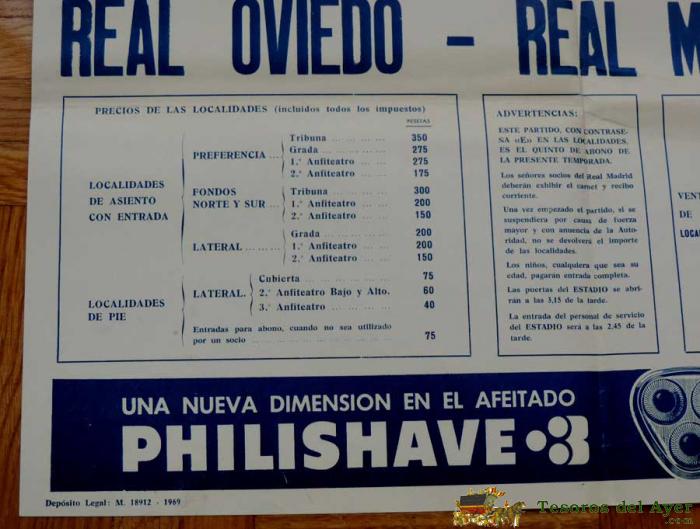 1972, CARTEL ORIGINAL REAL MADRID, REAL OVIEDO, CAMPEONATO DE LIGA, PRIMERA DIVISION, 12 DE NOVIEMBRE DE 1972, ALTAMIRA S.A., ESTADIO SANTIAGO BERNABEU - MIDE 70 X 47,5 CMS - RARISIMO, PIEZA DE MUSEO.