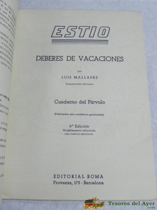 ESTIO, DEBERES DE VACACIONES, PARA EL PARVULO. LUIS MALLAFRÉ.TIENE 32 PáGINAS. MIDE 16,5 X 23 CMS. EDITADO POR EDITORIAL ROMA (BARCELONA) EN EL AñO 1960 (11 EDICIóN). CON RECORTABLES.