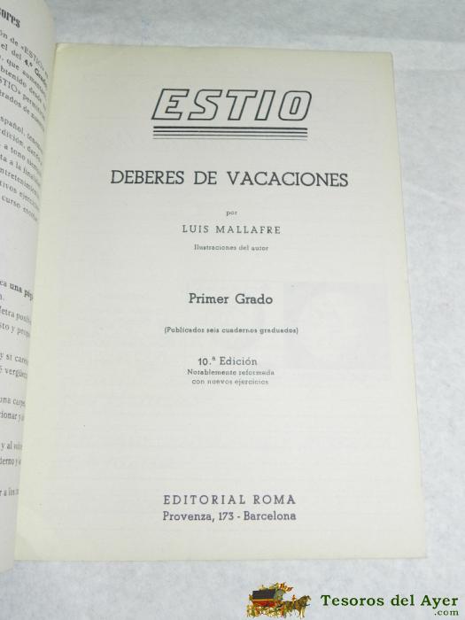ESTIO, DEBERES DE VACACIONES, PRIMER GRADO. LUIS MALLAFRÉ.TIENE 32 PáGINAS. MIDE 16,5 X 23 CMS. EDITADO POR EDITORIAL ROMA (BARCELONA) EN EL AñO 1960 (11 EDICIóN). CON RECORTABLES.