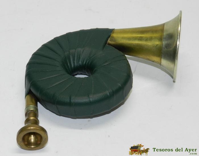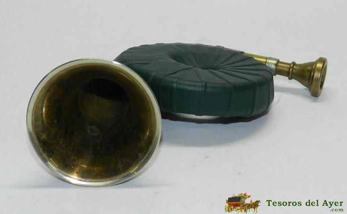 CORNETA O CORNETIN DE METAL, FORRADA EN IMITACION DE PIEL VERDE. POSIBLEMENTE DE LA LEGION, BUEN ESTADO. MIDE 14,5 X 7 CMS.