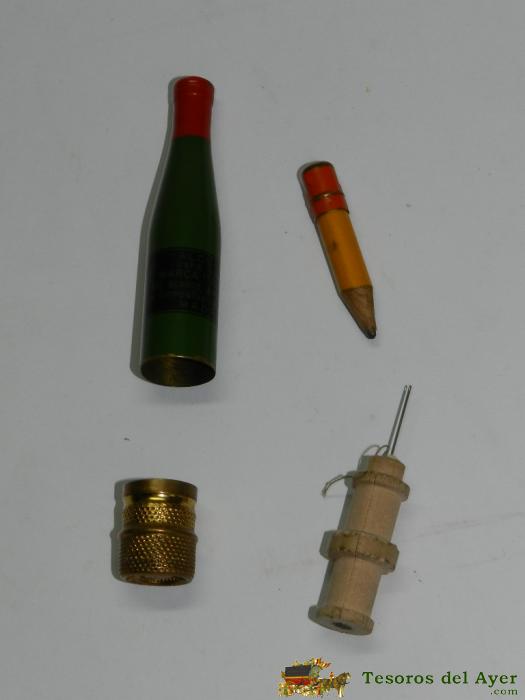 BOTELLITA MINIATURA CON PUBLICIDAD DE ALCOHOL PARA QUEMAR MARCA EL LEON, DENTRO LLEVA UN LAPICERO, AGUJA E HILO, MIDE LA BOTELLA 9 CMS. DE ALTURA.