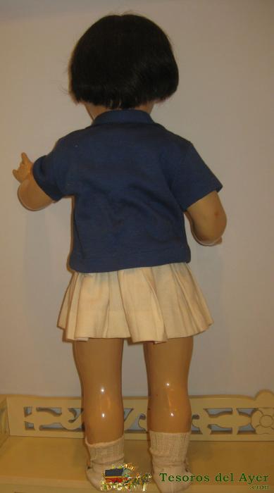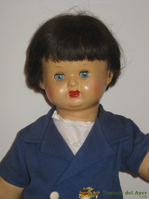 ANTIGUA MUÑECA ESPAÑOLA MILY DE LA CASA FLORIDO- AÑOS 50. CABELLO NATURAL CON MELENITA FRANCESA EN BUEN ESTADO, OJO DURMIENTE QUE CONSERVA TODAS LAS PESTAÑAS, VISTE UN CONJUNTO DE FALDA PLISADA EN LANILLAA FINA BLUSA ESTAMPADA Y BLASIER DE LANILLA. ZAPA