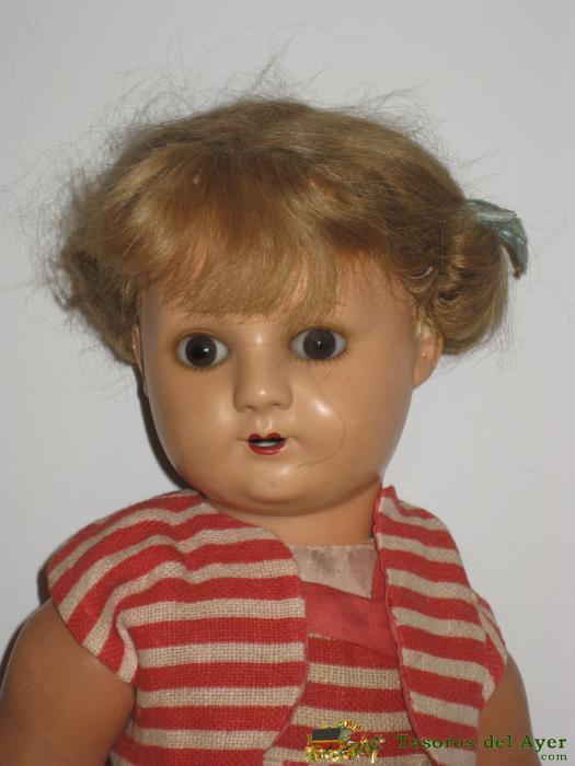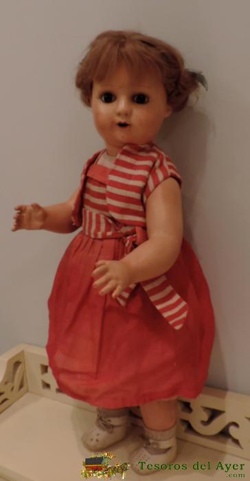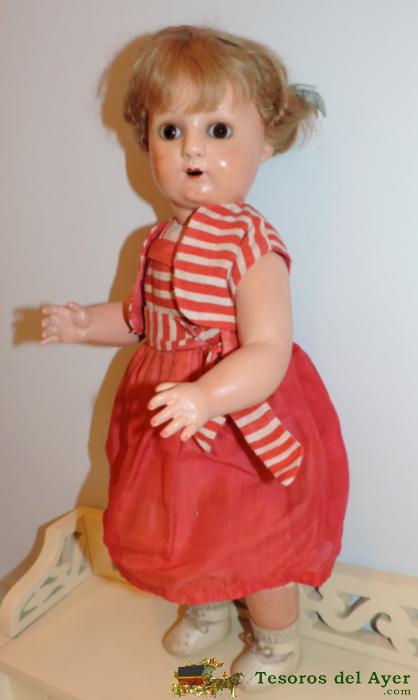 ANTIGUA MUñECA AñOS 30. MARCAS EN LA NUCA T B REALIZADA EN COMPOSICIóN. POR SUS CARACTERISTICAS PUEDE SER CATALANA. CABELLO DE MOHAIR EN BUEN ESTADO CON BONITO PEINADO RECOGIDO EN RODETES, OJO FIJO DE CRISTAL COLOR MIEL, VISTE UN CONJUNTO FORMADO POR VE
