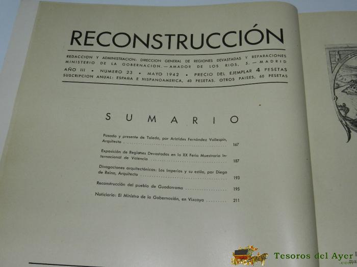 ANTIGUA REVISTA RECONSTRUCCION Nº 23 - DE LA DIRECCION DE REGIONES DEVASTADAS Y REPARACIONES MAYO 1942 - MUCHAS FOTOGRAFIAS E ILUSTRACIONES DE LA RECONSTRUCCION DEL PUEBLO DE GUADARRAMA (MADRID), PASADO Y PRESENTE DE TOLEDO, ETC...- MIRAR FOTO ADICIONAL C