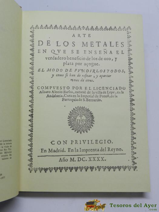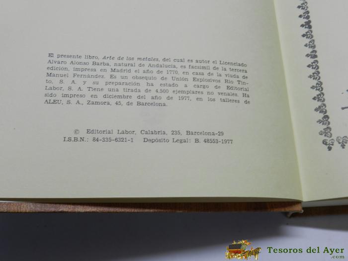 LIBRO ARTE DE LOS METALES, POR ALONSO BARBA, ÁLVARO, MINERíA. SIGLO XVII. AñO 1977. ED. LABOR. BARCELONA. 29 CM. XXIII P., 5 H., 228 P., 2 H. IL. ENCUADERNACIóN EN TAPA DURA DE EDITORIAL ILUSTRADA. ALONSO BARBA, ÁLVARO 1569-1662. POR ALVARO ALONSO BARBA. EN PORT.: UNIóN EXPLOSIVOS RIO TINTO S.A. INDICE. FACSIMIL DE LA TERCERA ED. IMPRESA EN. MADRID : VIUDA DE MANUEL FERNáNDEZ, 1770