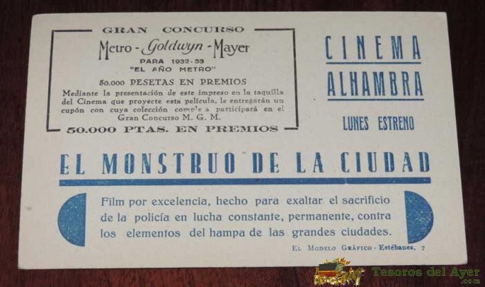 PROGRAMA DE CINE, EL MONSTRUO DE LA CIUDAD, POR WALTER HUSTON, CON PUBLICIDAD DELCINEMA ALHAMBRA, 1932 - 33