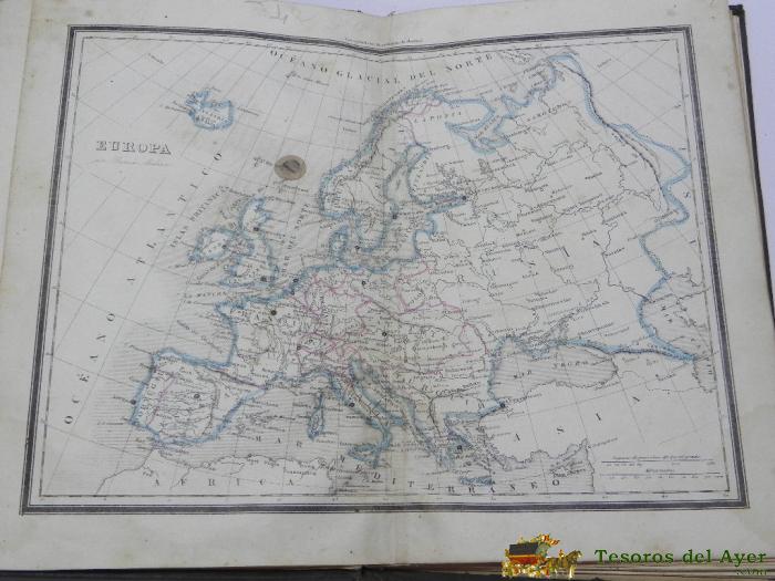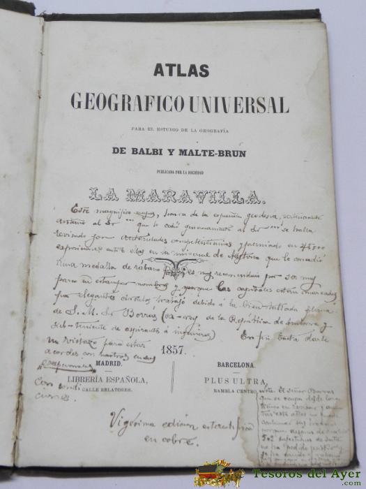 ATLAS GEOGRAFICO UNIVERSAL, DE BALBI Y MALTE-BRUN, LA MARAVILLA, 1857, MIDE 27 X 18 CM - 38 HOJAS, TAPA DURA - CON GRABADOS.