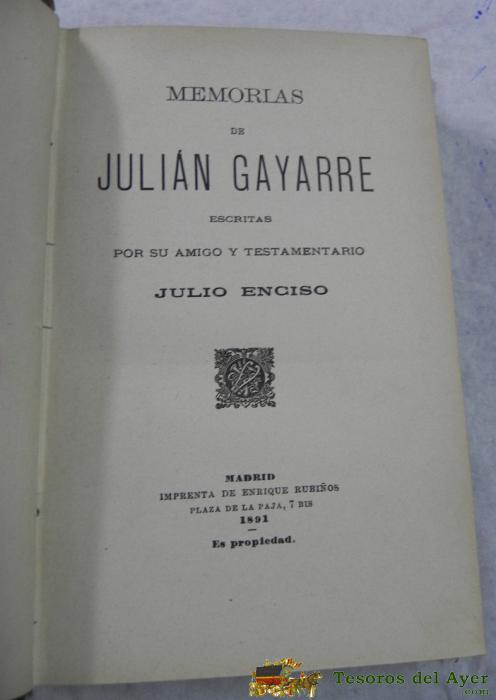 MEMORIAS DE JULIAN GAYARRE, POR JULIO ENCISO AÑO 1891, OPERA, MADRID, LA ESPAÑA EDITORIAL. 374 PÁGINAS. MIDE 19 X 12 CMS.