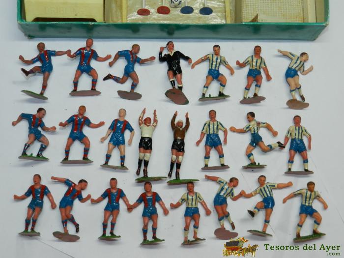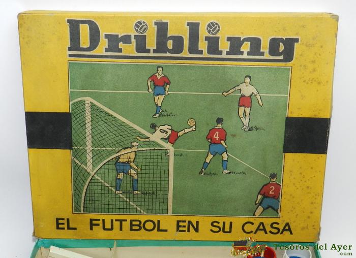 JUEGO DE FUTBOL DRIBLING, EQUIPOS DEL BARCELONA Y ESPAÑOL, COMANSI DE LOS AÑOS 60, COMPLETO, CONTIENE LOS 2 EQUIPOS DE 11 JUGADORES, EL ARBITRO, LAS 2 PORTERIAS Y PALOS, UN MARCADOR, 2 CUBILETES, 1 DADO, 4 BANDERINES, 1 BALON Y LIBRITO DE INSTRUCCIONES LA CAJA MIDE 32 X 26 CMS.