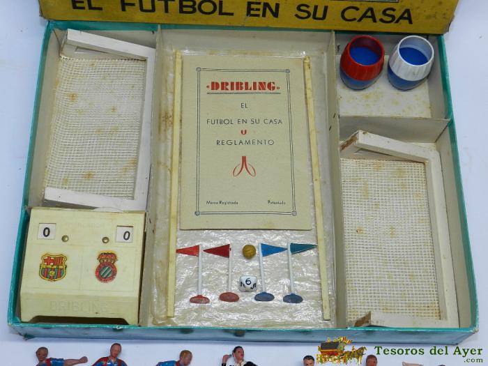 JUEGO DE FUTBOL DRIBLING, EQUIPOS DEL BARCELONA Y ESPAÑOL, COMANSI DE LOS AÑOS 60, COMPLETO, CONTIENE LOS 2 EQUIPOS DE 11 JUGADORES, EL ARBITRO, LAS 2 PORTERIAS Y PALOS, UN MARCADOR, 2 CUBILETES, 1 DADO, 4 BANDERINES, 1 BALON Y LIBRITO DE INSTRUCCIONES L