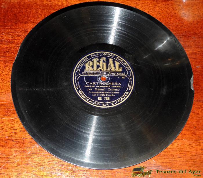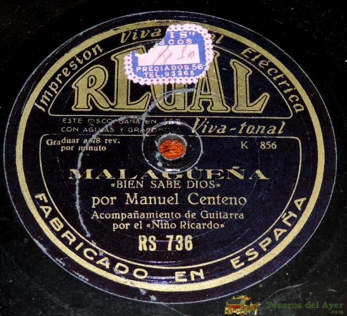 DISCO DE PIZARRA DE MANUEL CENTENO, ACOMP. GUITARRA NIÑO RICARDO, MALAGUEÑA (BIEN SABE DIOS) / CARTAGENERA (PORQUE OLVIDARTE QUERIA), ED. REGAL, RS 736, TIENE 4 GOLPECITOS EN LOS BORDES, PERO NO PARECEN QUE AFECTEN AL SONIDO DEL DISCO.