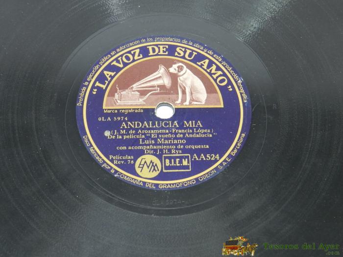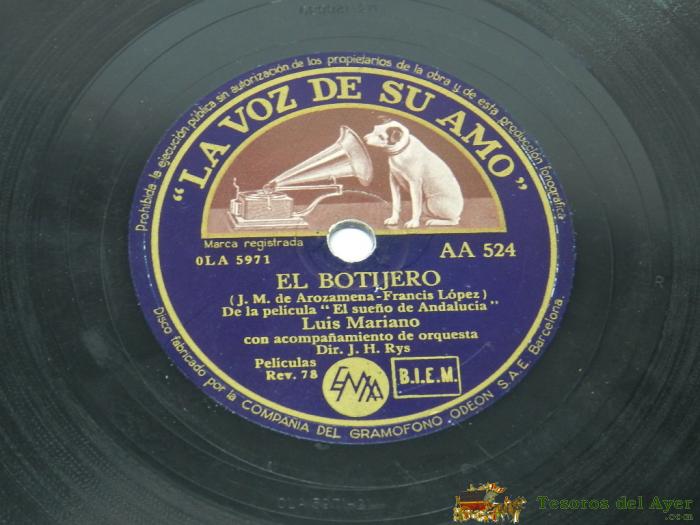 DISCO DE PIZARRA DE LUIS MARIANO - EL BOTIJERO / ANDALUCIA MIA - ED. LA VOZ DE SU AMO AA 524, EL BOTIJERO (JESúS MARíA DE AROZAMENA BERASATEGUI, FRANCIS LóPEZ) / ANDALUCIA MIA (JESúS MARíA DE AROZAMENA BERASATEGUI, FRANCIS LóPEZ).