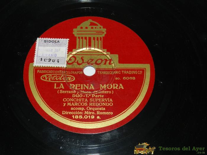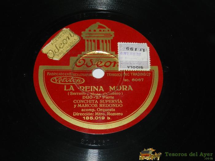 DISCO DE PIZARRA LA REINA MORA, POR CONCHITA SUPERVíA Y MARCOS REDONDO, ED. ODEON 185.019, BUEN ESTADO.