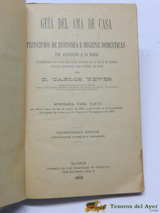 LIBRO GUÍA DEL AMA DE CASA, POR C. YEVES, (SUC. HERNANDO, 1913) TIENE 112 PÁGINAS. MIDE 18 X 11 CMS.