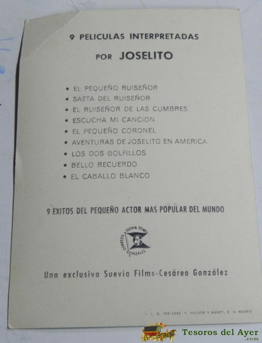 FOTO POSTAL DE JOSELITO, REVERSO CON PUBLICIDAD DE SUEVIA FILMS-CESAREO GONZALEZ, 3ED. HAUSER Y MENET 1962.