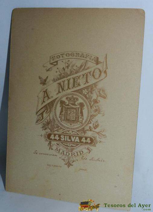 FOTOGRAFIA ALBUMINA DE NIÑAS CON MUÑECA Y GATO CON CARTEL DE PUBLICIDAD DE LA TRINIDAD (CHOCOLATE ROMERO Y GRANDE), FOT. A. NIETO, MADRID, MIDE 16 X 10,5 CMS.