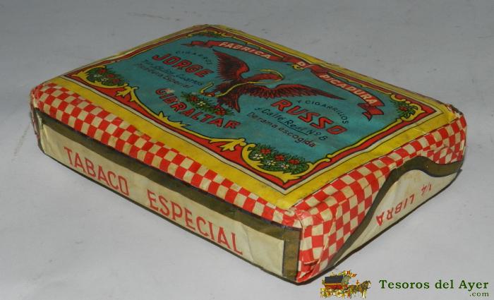 ANTIGUO PAQUETE DE TABACO, UN CUARTO DE LIBRA, PICADURA ESPECIAL JORGE RUSSO, JORGE RUSSO, CALLE REAL Nº 8 GIBRALTAR. MIDE 12 X 8 CM. TAL COMO SE VE EN LAS FOTOS PUESTAS.