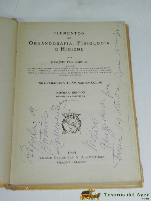 LIBRO DE TEXTO ELEMENTOS ORGANOGRAFíA FISIOLOGíA E HIGIENE, POR JOAQUíN PLA CARGOL - ED DALMAU CARLES, AñO 1944. TIENE 266 PAG, MIDE 20 X 13,5 CMS. CON DEDICATORIA EN LA PRIMERA PAGINA.