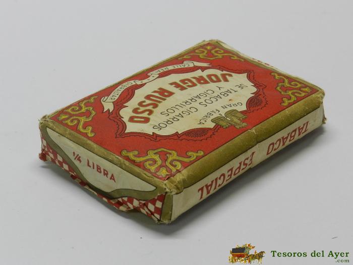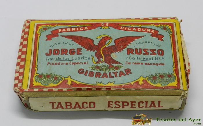 ANTIGUO PAQUETE DE TABACO, UN CUARTO DE LIBRA, PICADURA ESPECIAL JORGE RUSSO, JORGE RUSSO, CALLE REAL Nº 8 GIBRALTAR. MIDE 12 X 8 CM. TAL COMO SE VE EN LAS FOTOS PUESTAS.