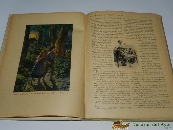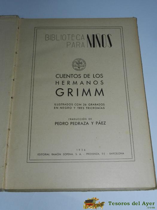 CUENTOS DE LOS HERMANOS GRIMM. 1936 - ED. SOPENA, ILUSTRADO 26 GRAB. EN NEGRO Y 3 TRICONONOMIAS - TRADUCCION DE PEDRO PEDRAZA. 18 X 25 CMS - 61PP - CUBIERTA ILUSTRADA POR PALAO.