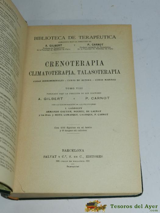 LIBRO DE MEDICINA - CRENOTERAPIA, CLIMATOTERAPIA, TALASOTERAPIA. BIBLIOTECA DE TERAPEúTICA TOMO VIII, AUTORES: A. GILBERT Y P. CARNOT. TAPA BLANDA. TIENE 736 PáGINAS.