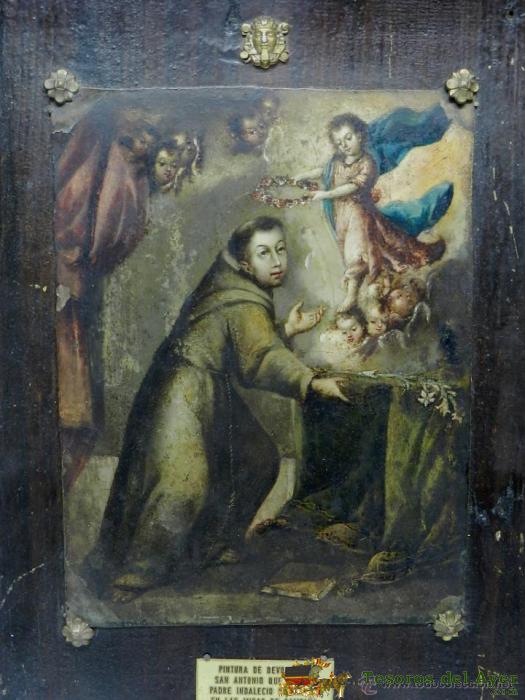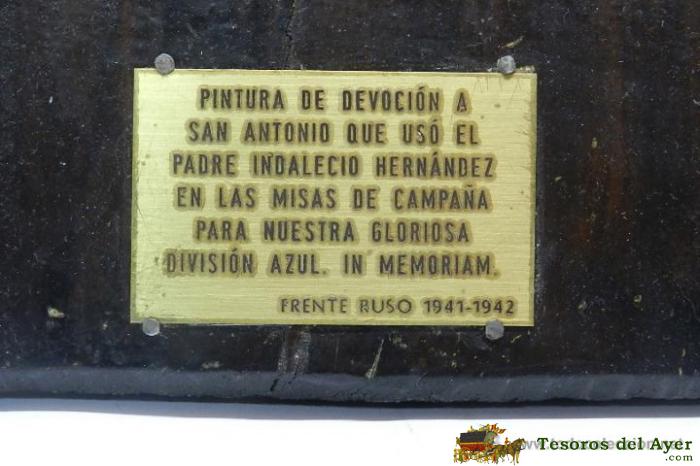 DIVISION AZUL, PINTURA DE DEVOCION A SAN ANTONIO, QUE USO EL PADRE INDALECIO HERNANDEZ EN LAS MISAS DE CAMPAÑA PARA NUESTRA GLORIOSA DIVISION AZUL, FRENTE RUSO 1941 - 1942, PINTURA SOBRE BRONCE, EXCEPCIONAL PIEZA DE MUSEO, MIDE 39 X 28 CMS.