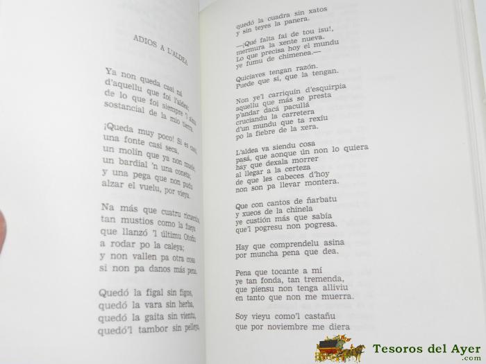 RúSTICA ILUSTRADA EDITORIAL. MIDE 21 X 15 CM. TIENE 200 PáGINAS. RETRATO DEL AUTOR EN FRONTIS. PRóLOGO DE CARMEN DíAZ CASTAñóN Y EPíLOGO DE VICTOR URDANGARAY ARGüELLES. PORTADA DE MANUEL SORIA GUTIéRREZ. DIBUJOS EXCLUSIVOS A PLUMILLA DE A. MACARRóN, CáSTOR, MORENO, NICIEZA Y SORIA. POESíA EN BABLE. HISTORIA LOCAL.