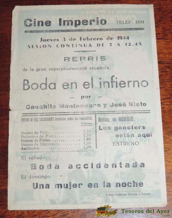 BODA EN EL INFIERNO. CONCHITA MONTENEGRO. J. NIETO, MANOLO MORÁN. PUBLICIDAD DEL CINE IMPERIO 1944