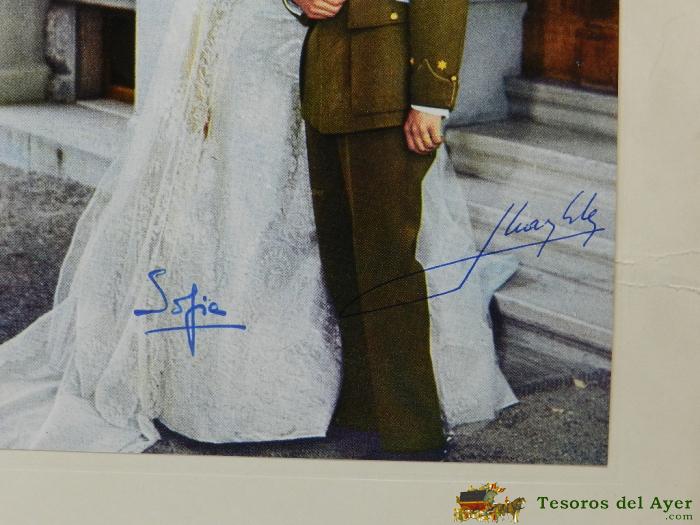 FOTOGRAFIA DE LA BODA DEL REY DON JUAN CARLOS I Y DOÑA SOFIA, CON SUS FIRMAS AUTOGRAFAS, ATENAS 14 DE MAYO DE 1962 - MIDE 24 X 18 CM.