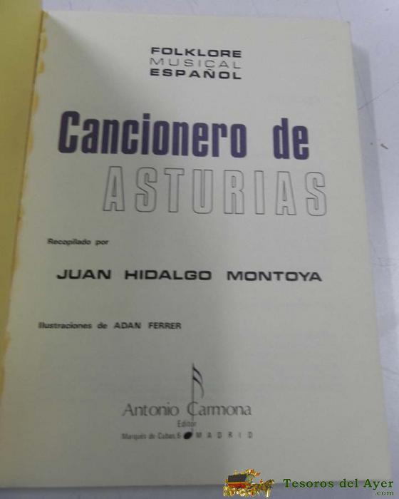 CANCIONERO DE ASTURIAS. JUAN HIDALGO MONTOYA. ED. CARMONA. AñO 1973. MIDE 21 X 15 CMS. TAPAS CARTóN. TIENE 160 PAGS. INCLUYE LETRA Y PARTITURA DE MáS DE 160 CANCIONES.