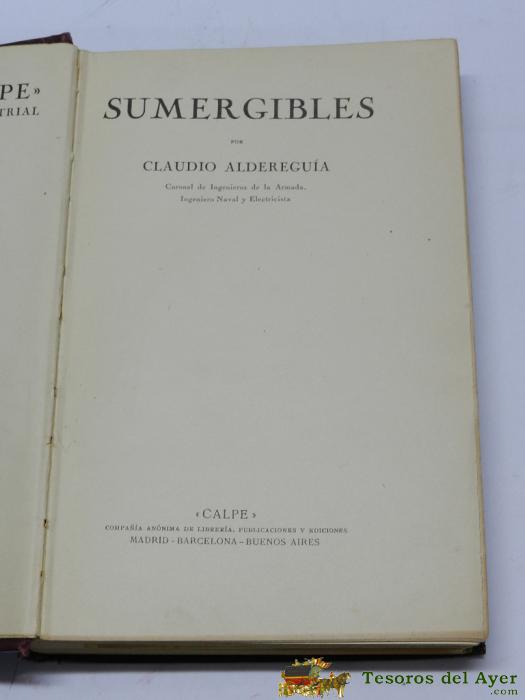 LIBRO SUMERGIBLES POR ALDEREGUÍA, CLAUDIO, ED. CALPE, MANUALES CALPE DE INGENIERíA CIVIL, INDUSTRIAL Y MILITAR, BAJO LA DIRECCIóN DE E. TERRADAS, BARCELONA, 1923. TELA EDITORIAL CON DORADOS EN LOMO. OBRA ILUSTRADA CON 212 FIGURAS Y TRES GRáFICOS DESPLEGAB
