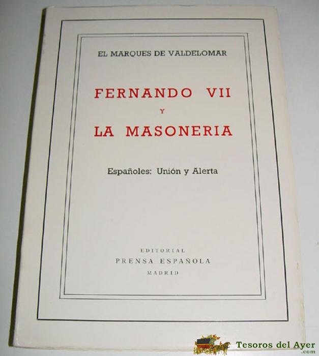 FERNANDO VII Y LA MASONERIA. ESPAÑOLES UNION Y ALERTA - MARQUES DE VALDOMAR - PRENSA ESPAÑOLA MASONERIA HISTORIA DE LA MASONERIA EN UN PERIODO IMPORTANTE DE LA HISTORIA ESPAÑOLA. PROLOGO DE ISIDORO ANTAÑON, CUBIERTAS ORIGINALES MADRID 1970 BUENA 21X15