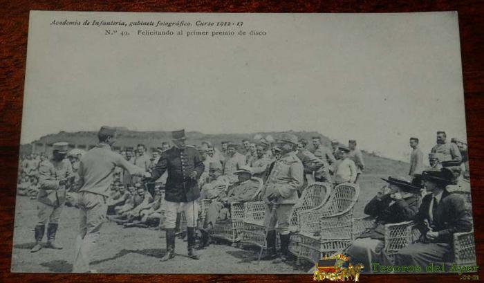 ANTIGUA POSTAL DE LA ACADEMIA DE INFANTERIA, GABINETE FOTOGRAFICO - CURSO 1912 / 13 - N. 49 - FELICITANDO AL PRIMER PREMIO DE DISCO - NO CIRCULADA - ED. PELAEZ. ESCRITA POR EL REVERSO.