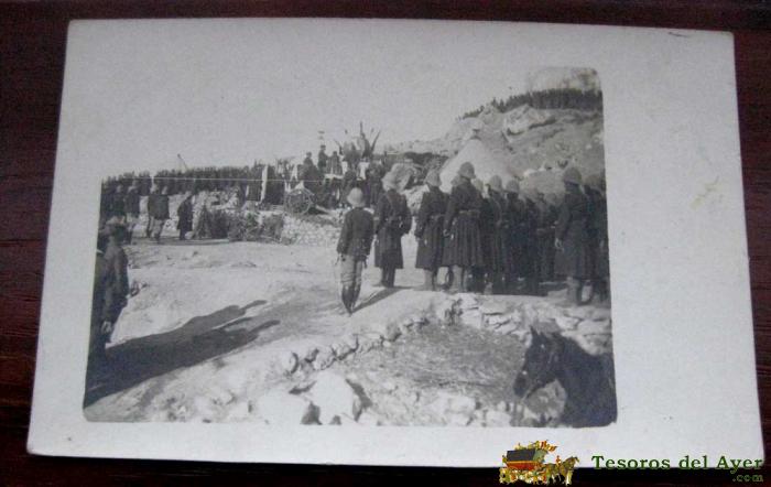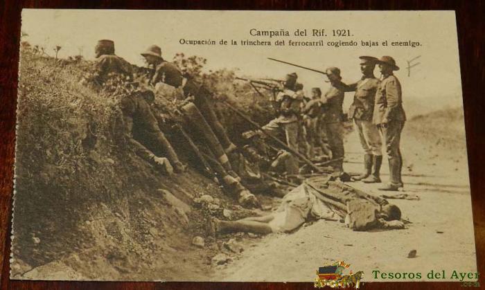 POSTAL DE LA CAMPAÑA DEL RIF 1921, 0CUPACION DE LA TRINCHERA DEL FERROCARRIL COGIENDO BAJAS AL ENEMIGO, EDICION M.V. POSTAL EXPRES, MELILLA.