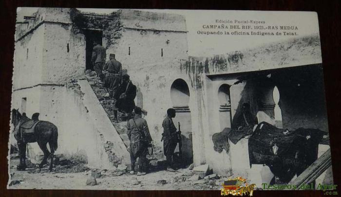 ANTIGUA POSTAL DE LA CAMPAÑA DE EL RIF - RAS MEDUA - AÑO 1921 - OCUPANDO LA OFICINA INDIGENA DE TELAT - SERIE XI - ED. POSTAL EXPRES, MELILLA - NO CIRCULADA.