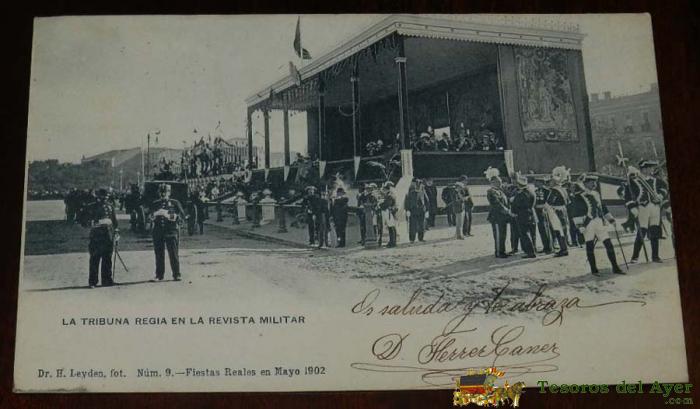 POSTAL DE LA TRIBUNA REGIA EN LA REVISTA MILITAR. FIESTAS REALES EN MAYO 1902. (DR. H. LEYDEN, Nº 9), REVERSO SIN DIVIDIR, CIRCULADA.