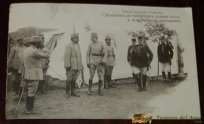 POSTAL DE LA ACADEMIA DE INFANTERIA. S. M. EL REY ALFONSO XIII EN EL CAMPAMENTO, ED. GABINETE FOTOGRÁFICO (CARMONA), NO CIRCULADA.