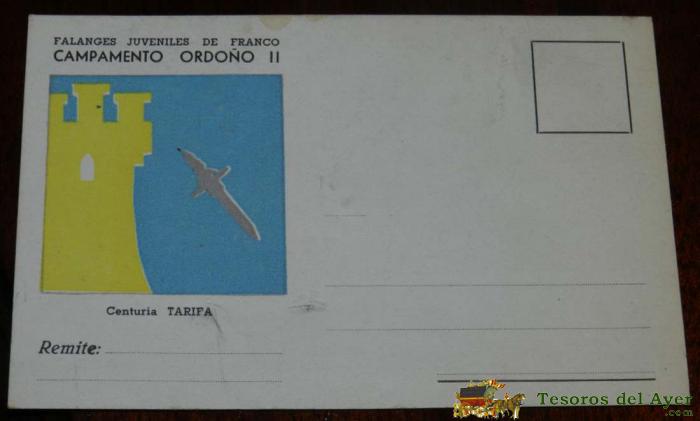 ANTIGUA POSTAL DE LAS FALANGES JUVENILES DE FRANCO, FALANGE, F.E.T. - CAMPAMENTO ORDOÑO II DE RIAñO (LEóN) . CENTURIA TARIFA, SIN CIRCULAR, EXCELENTE ESTADO DE CONSERVACION.