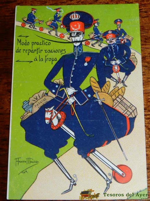 ANTIGUA POSTAL DE CARICATURAS - MILITARES - ILUSTRADAS POR ARCADIO MORALEDA - MODO PRACTICO DE REPARTIR RACIONES A LA TROPA, NO CIRCULADA - ED. JOSE BLASS Y CIA.