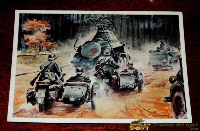 POSTAL DE LA WEHRMACHT, AUFKLÄRUNGSTRUPP MIT PANZERSPÄHGEN IM VORMARSCH, VERLAG: GRIESHABER & SÄUBERLICH, NO CIRCULADA.