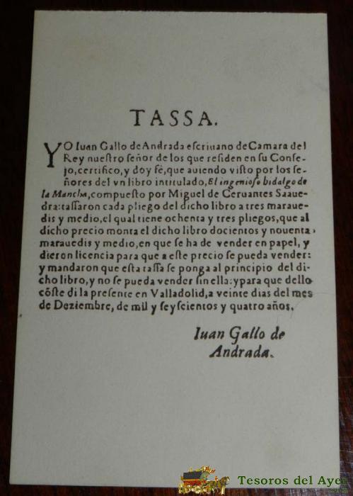 ANTIGUA POSTAL, DON QUIJOTE DE LA MANCHA DE MIGUEL DE CERVANTES SAAVEDRA, 1928, TESTIMONIO DEL ESCRIBANO DE CAMARA DEL REY PONIENDO PRECIO AL LIBRO, SIN CIRCULAR. OLD POSTCARD, DON QUIXOTE IN MIGUEL DE CERVANTES SAAVEDRA, 1928, TESTIMONY OF THE CLERK OF T