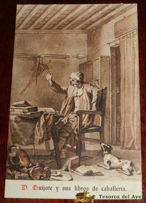ANTIGUA POSTAL, DON QUIJOTE DE LA MANCHA DE MIGUEL DE CERVANTES SAAVEDRA, 1928, ILUSTRACION DE DON QUIJOTE CON SUS LIBROS DE CABALLERIA, SIN CIRCULAR. OLD POSTCARD, DON QUIXOTE IN MIGUEL DE CERVANTES SAAVEDRA, 1928, ILLUSTRATION OF DON QUIXOTE WITH HIS BO