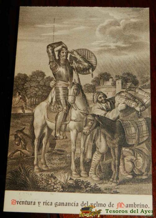 ANTIGUA POSTAL, DON QUIJOTE DE LA MANCHA DE MIGUEL DE CERVANTES SAAVEDRA, 1928, ILUSTRACION DE LA AVENTURA Y RIEA GANANCIA DEL YELMO DE MAMBRINO, SIN CIRCULAR. OLD POSTCARD, DON QUIXOTE IN MIGUEL DE CERVANTES SAAVEDRA, 1928, ILLUSTRATION OF ADVENTURE AND
