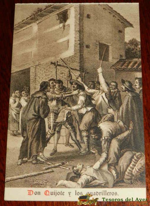 ANTIGUA POSTAL, DON QUIJOTE DE LA MANCHA DE MIGUEL DE CERVANTES SAAVEDRA, 1928, DON QUIJOTE Y LOS QUADRILLEROS, SIN CIRCULAR. OLD POSTCARD, DON QUIXOTE IN MIGUEL DE CERVANTES SAAVEDRA, 1928, DON QUIXOTE AND QUADRILLEROS, UNCIRCULATED.