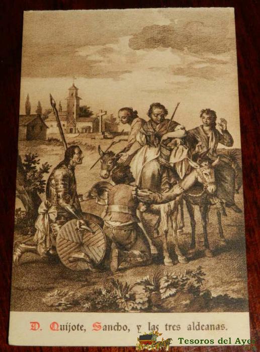 ANTIGUA POSTAL, DON QUIJOTE DE LA MANCHA DE MIGUEL DE CERVANTES SAAVEDRA, 1928, DON QUIJOTE, SANCHO Y LAS TRRES ALDEANAS, SIN CIRCULAR. OLD POSTCARD, DON QUIXOTE IN MIGUEL DE CERVANTES SAAVEDRA, 1928, DON QUIXOTE, SANCHO AND TRRES VILLAGE, NOT CIRCULAR.