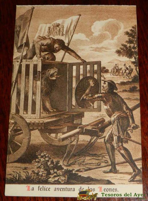 ANTIGUA POSTAL, DON QUIJOTE DE LA MANCHA DE MIGUEL DE CERVANTES SAAVEDRA, 1928, LA FELICE AVENTURA DE LOS LEONES, SIN CIRCULAR. OLD POSTCARD, DON QUIXOTE BY MIGUEL DE CERVANTES SAAVEDRA, 1928, THE FELICE ADVENTURE OF THE LIONS, NOT CIRCULAR.