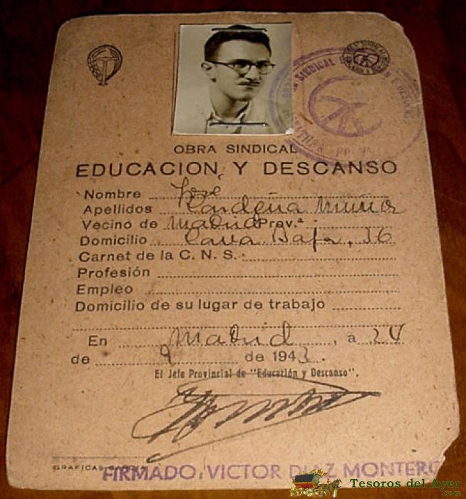 ANTIGUO CARNET OBRA SINDICAL EDUCACION Y DESCANSO . - 1943 - 11,5 X 8,5 CMS.