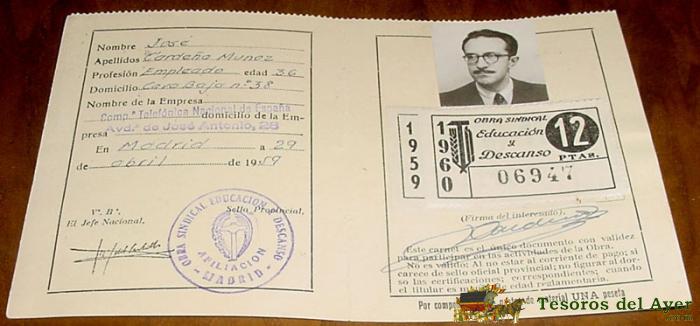ANTIGUO CARNET DE LA DELEGACION NACIONAL DE SINDICATOS . OBRA SINDICAL EDUCACION Y DESCANSO . - 1959 - 11,5 X 8,5 CMS.